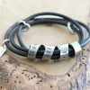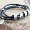 A custom silver and leather triple wrap bracelet for men and woman, personalized with your own secret spinning message and a small word tag to finish your statement. This new addition to our original and best selling Secret Spinning Message Bracelet Collection brings a simple, unisex design and includes the wildly popular leather and silver wrap concept.