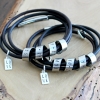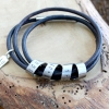 A custom silver and leather triple wrap bracelet for men and woman, personalized with your own secret spinning message and a small word tag to finish your statement. This new addition to our original and best selling Secret Spinning Message Bracelet Collection brings a simple, unisex design and includes the wildly popular leather and silver wrap concept.