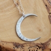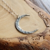 The "What Side Are You On" personalized fine silver large skinny and sexy crescent moon necklace was sent to the stylist at the hit TV show The Vampire Diaries, and was worn by Bonnie on episode 12 of season 4 and is now available to you.** This piece is reversable and can be worn on the light polished hammered side or worn on the gunmetal dark finish side depending on your mood. Sleek and sexy. Stunning as is or can be personalized with a tiny initial or as a couple necklace with 2 initials in the format of "C+J".