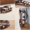 The unique and artisan made spinner charms are created by me from a single piece of 1/4" x 6" german silver. It his hand stamped with your message in your choice of handwriting. See photo #5 for your options. The 7 strands of 2mm leather used per bracelet is a premium quality naturally died round genuine leather cord.