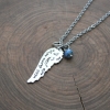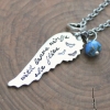This inspirational wing necklace is hand stamped with the quote "with brave wings she flies," adorned with a sky blue Czech glass bead and a pewter heart charm. I love this necklace as a graduation gift or for someone embarking on a new chapter or adventure in their life.
