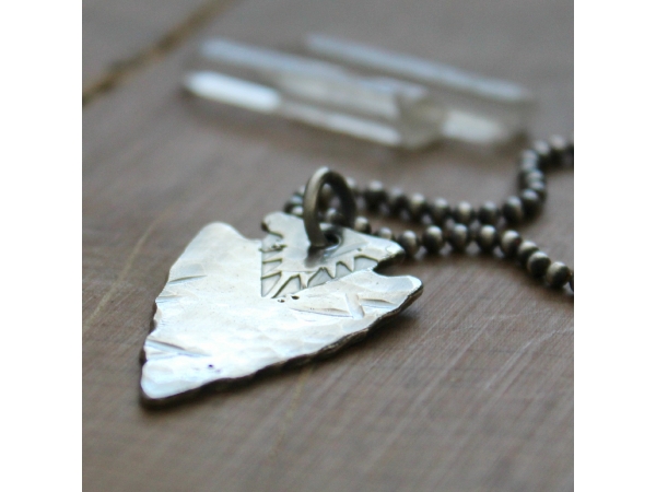 This rugged and masculine, personalized, men's fine silver arrowhead necklace can be hand stamped with any one word, name, date or initials to customize the piece. The arrowhead is a native symbol for alertness and a symbol of strength.