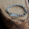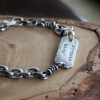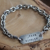 This handmade sterling silver men's bracelet has a time worn and rustic inspired "trashed" look. The tag has been randomly textured and the entire bracelet is oxidized. The dark, gunmetal oxidization has been removed from the high areas and polished leaving the reccessed spots dark for more detail.