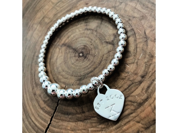 Personalized graduated silver bead heart charm bracelet. A simple and delicate sterling silver stretch bead bracelet with a hand stamped sterling silver heart charm is personalized with your initial and est. year of choice. This makes a beautiful sweet 16 or birthday gift. Choose as many beaded name bracelets as you need to create your perfect stack!
