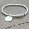 Personalized Graduated silver bead name bracelet. A simple and delicate sterling silver stretch bead bracelet with a hand stamped sterling silver round name charm is personalized with your name and font of choice. Choose as many beaded name bracelets as you need to create your perfect stack!