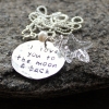 This handcrafted I love you to the moon & back hand stamped necklace has been a customer favorite by special request and is now available to order with a stunning faceted Swarovski crystal faceted star charm and a fresh water pearl accent.