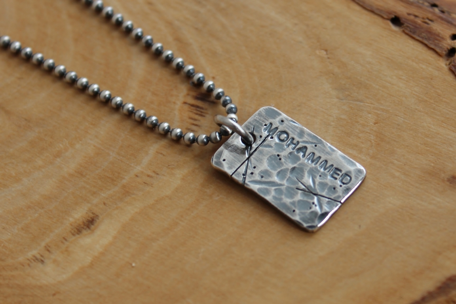 This handcrafted and hand stamped fine silver trashed and taxtured dog tag name necklace is raw and masculine. It's hammered and slashed texture creates a rustic modern vintage look. Personalize your piece with any one name, date, word or initials per tag in the tiny uppercase font shown.