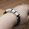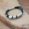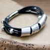 This handcrafted, hand stamped spinning statement bracelet of sterling silver and leather is personalized with a longer secret message of choice. 7 layers of fine leather cord are threaded with 6 silver beads and your double wide spinning message, then finished with a substantial stainless steel locking closure that is easy to use one handed and is as comfortable to wear as it is stunning to look at.
