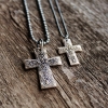This handcrafted solid bronze cross is ornate but rustic in appearance with all it's texture and oxidization giving it an instant time worn feel and perfect for everyday. The sterling silver chain and ring that holds the bronze pendant have also been given a dark oxidization to leave them a charcoal colour with some areas sanded to reveal the natural silver tone. I hand forge the bronze and stamp it with the cross design. It's finished with a hammered look and heavily oxidized, leaving the low areas blackened and the high areas are polished and smooth. A great example of texture and contrast. This piece measures approx 1" by 3/4" in size and is a thick piece of hammered bronze. The chain is your choice of a 16" or 18" ball chain.