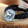Customize this large statement, fine silver, running strong & free spirit medallion bracelet with your personalized size and premium, thick, double strand, braided leather band colour choice. This is truly a magnificent statement bracelet that is both elegant and rustic with an equestrian look. Why tame your spirit when it can be Wild & Free.